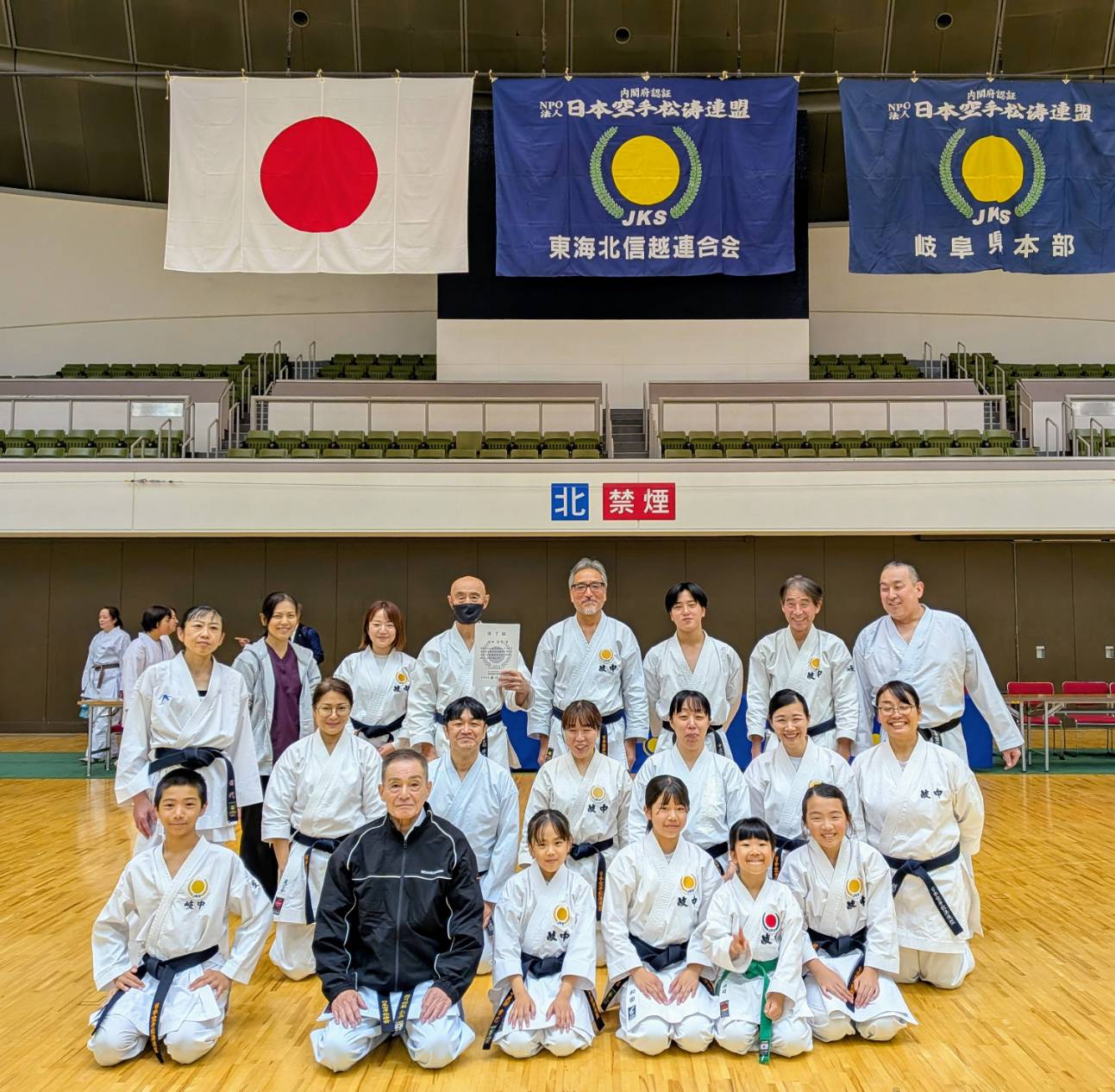 11/3(月・祝) 令和7年度東海北信越地区(総本部・B級事業体)技術講習会 技術講習会・段位審査会・各種資格審査会が岐阜メモリアルセンターに於いて行われました。 岐中支部からは指導員・道場生23名が受講・段位受験・資格受験に7名が挑戦! 見事、全員合格! これからより一層の指導・空手道の探求へと心身ともに頑張ってください。